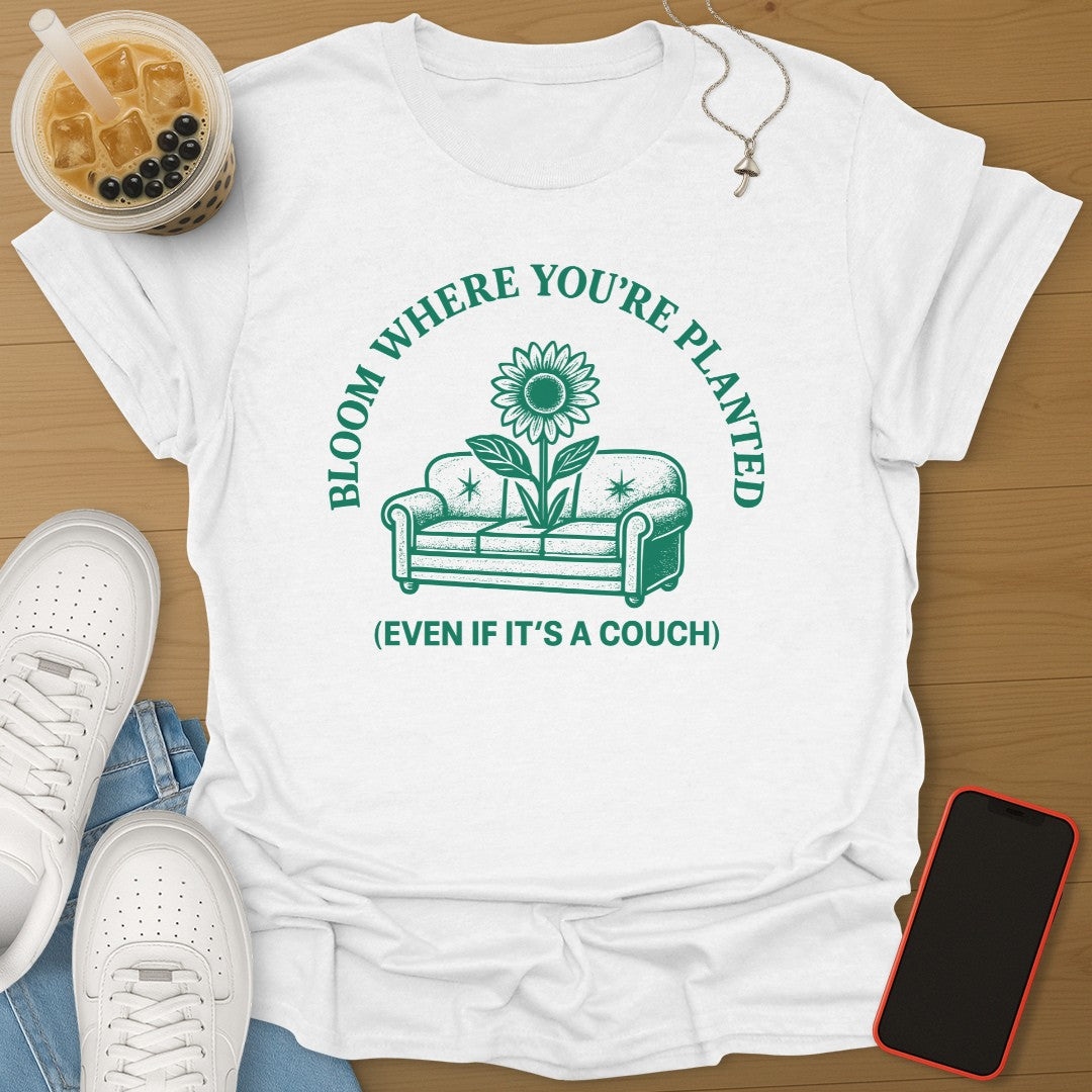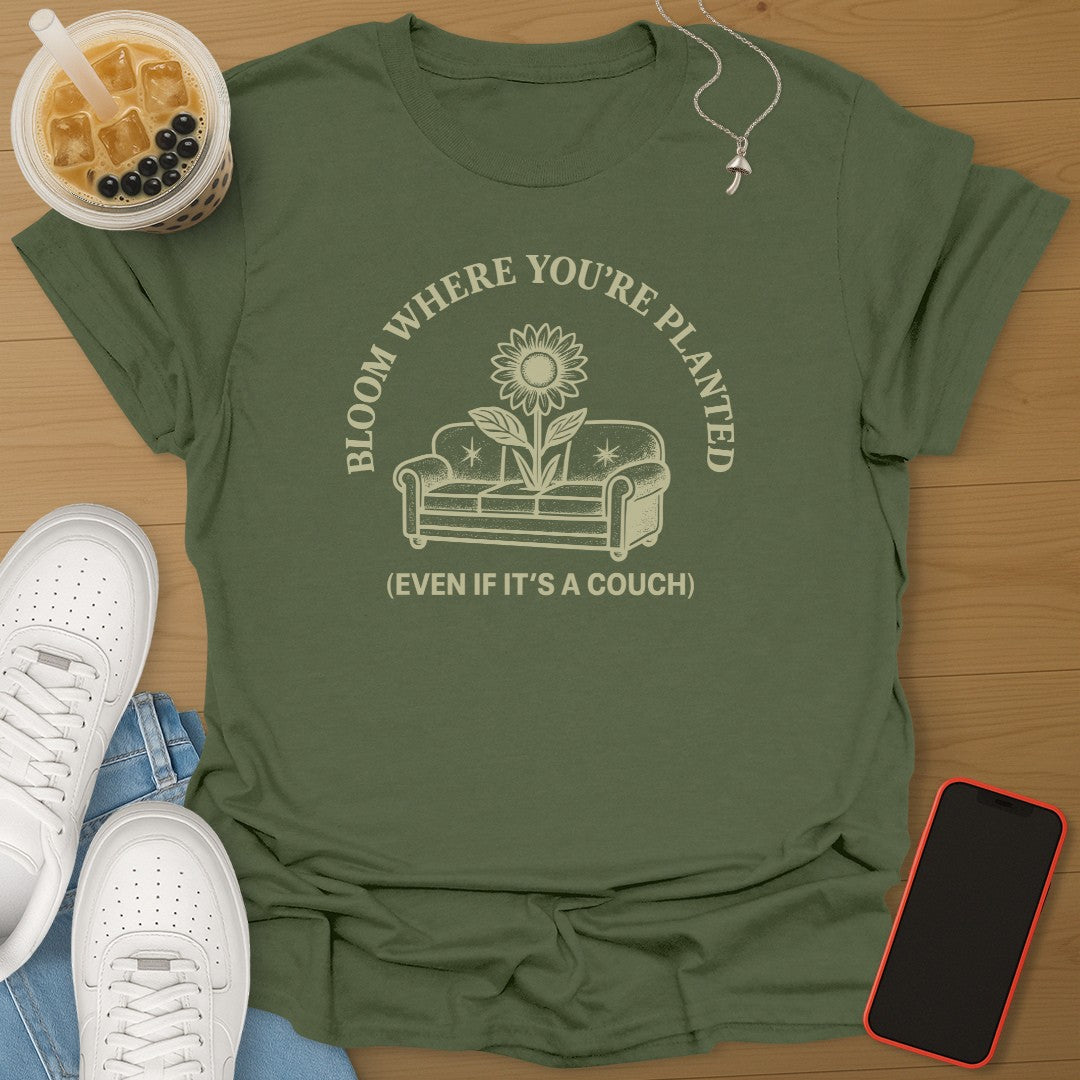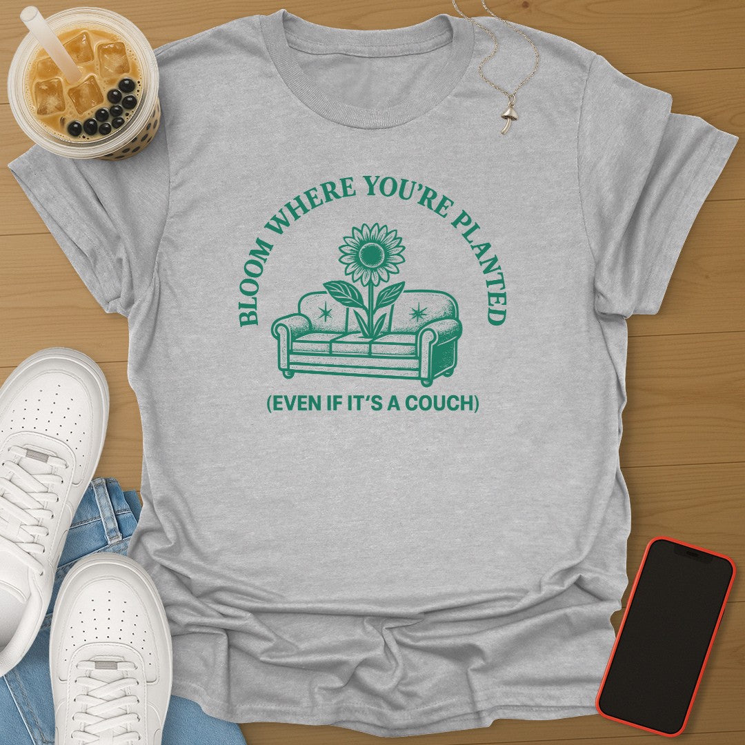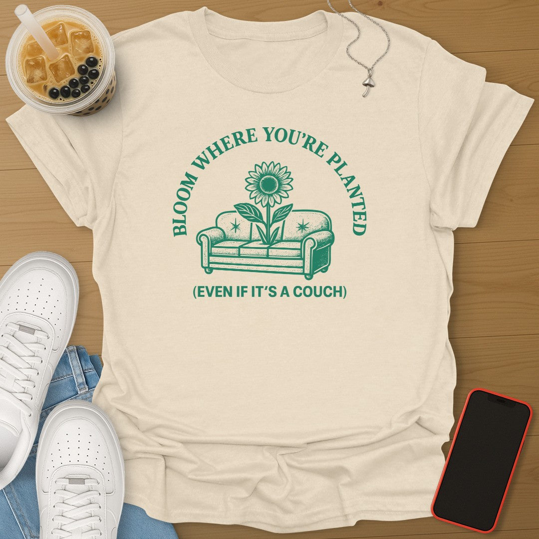 A sunflower growing from a couch says everything about thriving in less-than-ideal conditions. Cozy chaos in botanical form 🌻🛋️.