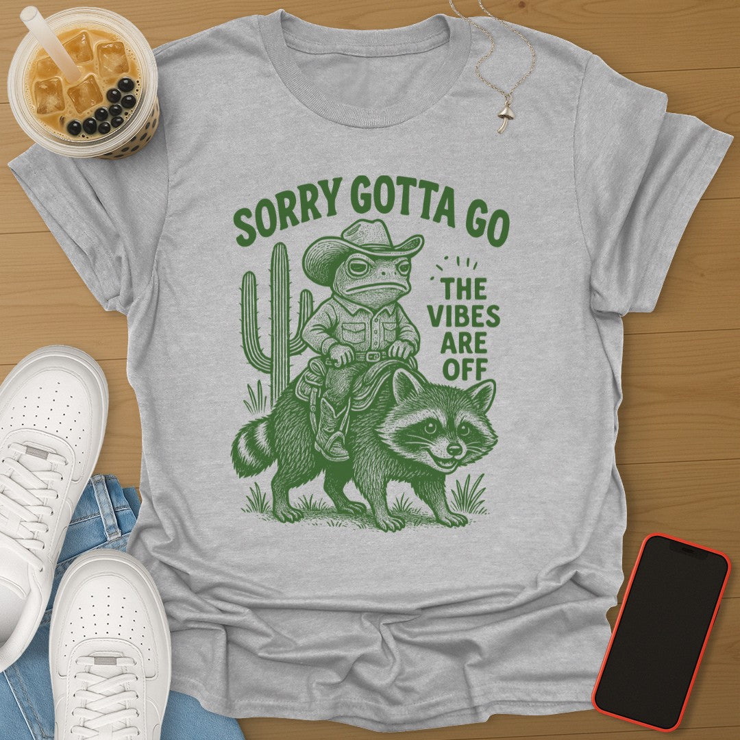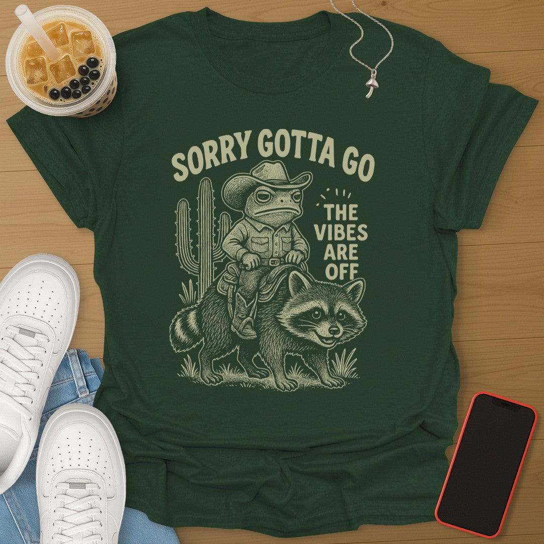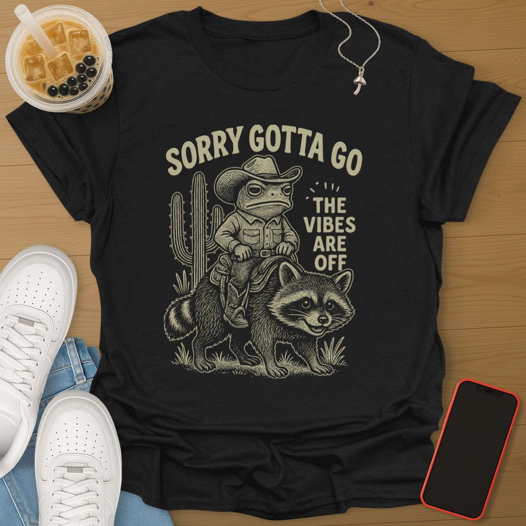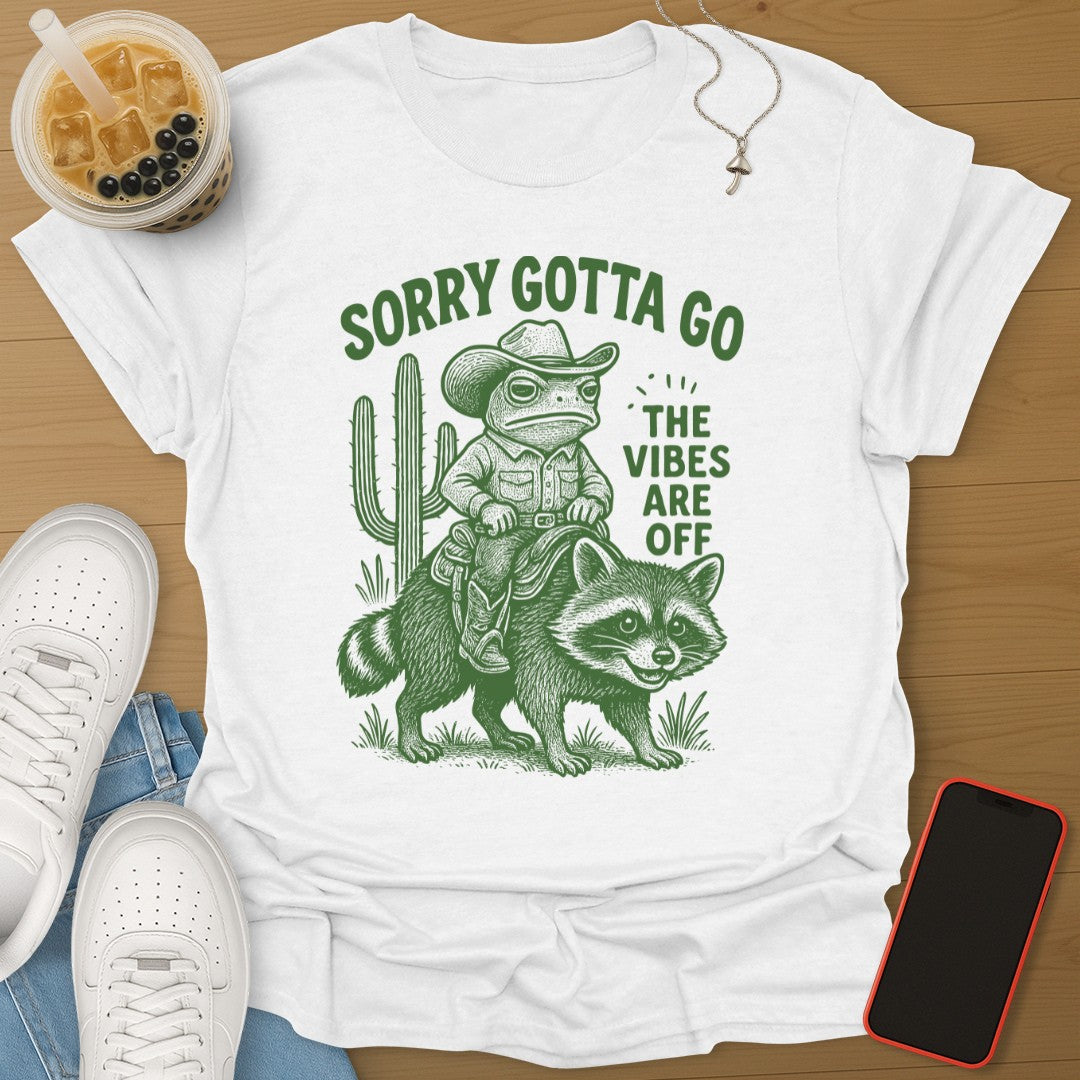 When the vibes are wrong, it is time to ride out. This tee delivers pure comedy with a cowboy frog, a trusty raccoon, and the perfect exit line đ¸đŚ.